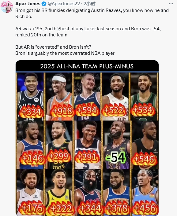 对此,有球迷列出了上赛季的各球星正负值为里夫斯鸣不平:“詹姆斯让他的忠实拥趸去贬低奥斯汀-里夫斯,这招大家都懂。里夫斯上赛季正负值为+195,是湖人队中第二高的,而詹姆斯的正负值为-54,在球队中排名第20位。但里夫斯却被认为是“被高估”了?实际上,詹姆斯可能是NBA中最被高估的球员之一。”