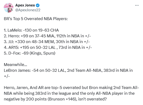 希罗、小贾伦-杰克逊和里夫斯被认为是最被高估的球员,但詹姆斯入选第二阵容且正负值排在联盟第383位,甚至比其他任何入选全明星的球员都至少低200分(如图—倒数第2布伦森为+146),这难道不是被高估吗?”