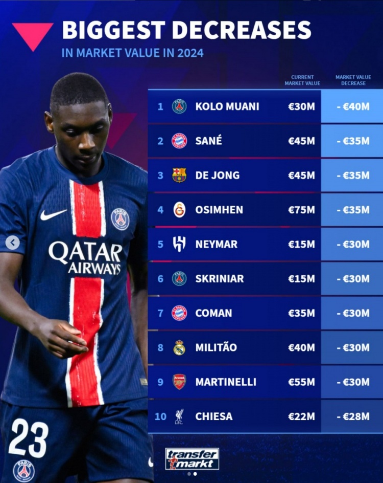 德转列2024年身价跌幅最大榜:穆阿尼-4000万欧居首,萨内次席