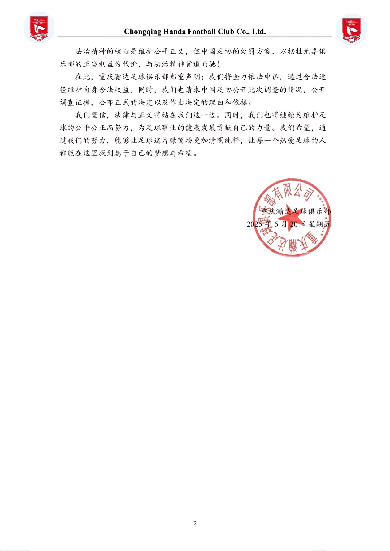 重庆瀚达俱乐部对中国足协将上述比赛认定为“消极比赛”无法接受,对所谓“专家组”提供的数据准确性表示质疑;对数据样本的严谨性表示质疑(仅以前2场比赛作为对比样本);不理解中国足协为何仅以传球次数、传球成功率、射门次数等简单指标就能定义一场比赛的性质?为何不参考其他诸如预期进球、跑动强度、压迫强度(PPDA)、转换次数、阵型平均间距、对抗成功率、每分钟进攻次数、定位球攻防效率等更为客观的指标?