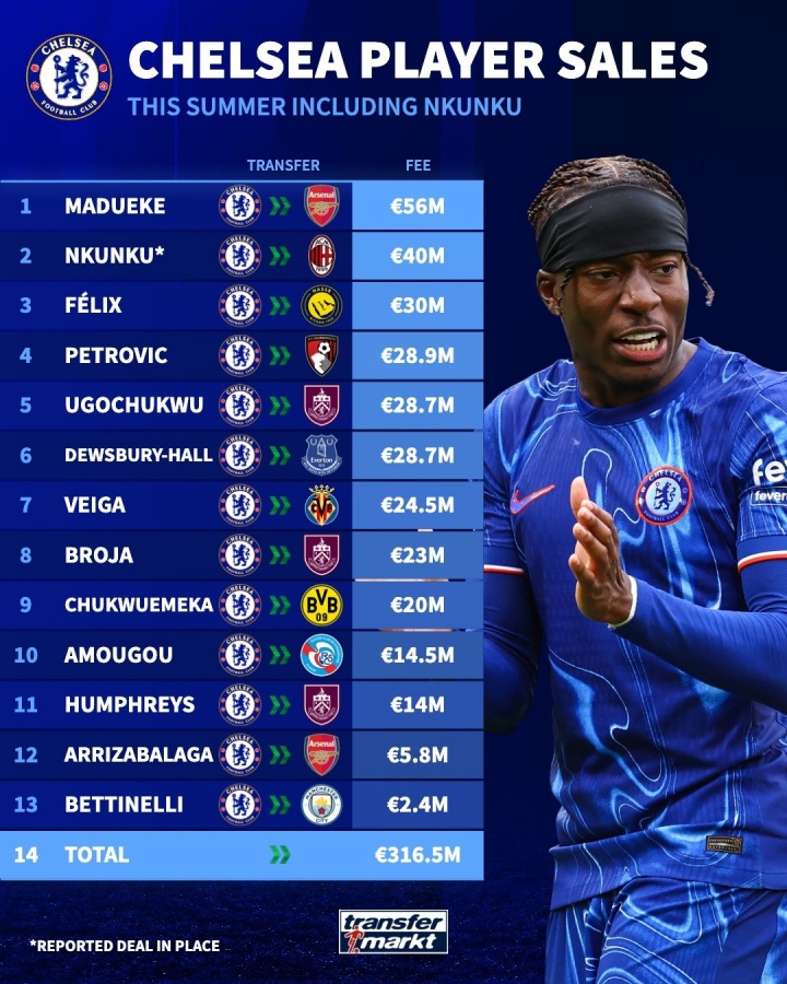 在此之前,切尔西已经完成了出售马杜埃凯、菲利克斯在内的13名球员,同时有多位小将租借离队,据德转统计已创造了约2.8亿欧元的收入。此外,他们向米兰卖出恩昆库的交易也已经达成协议,接近官宣。