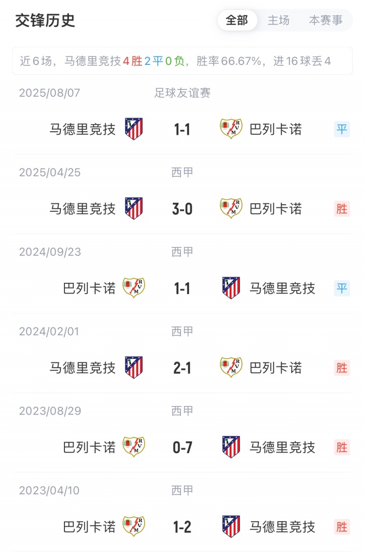 马竞联赛1胜3平1负暂位西甲第12,近2场不胜;巴列卡诺1胜2平2负积5分暂位第14,近3场不胜。马竞各赛事对阵巴列卡诺已连续18场不败(14胜4平)。