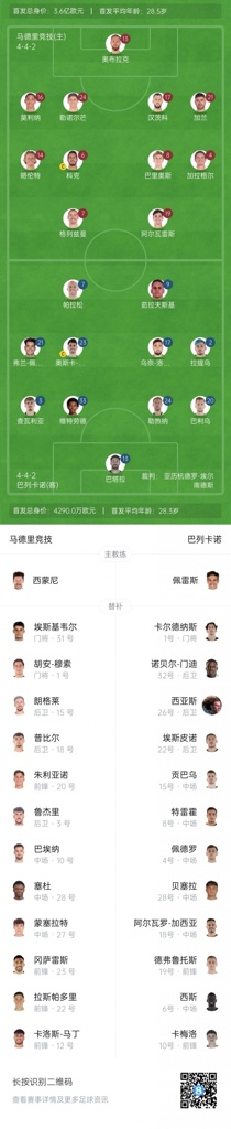 马德里竞技替补:1-穆索、31-埃斯基韦尔、3-鲁杰里、18-普比尔、15-朗格莱、20-朱利亚诺·西蒙尼、27-蒙塞拉特、38-塔费科·塞杜、10-巴埃纳、23-尼科·冈萨雷斯、12-卡洛斯·马丁、22-拉斯帕多里
