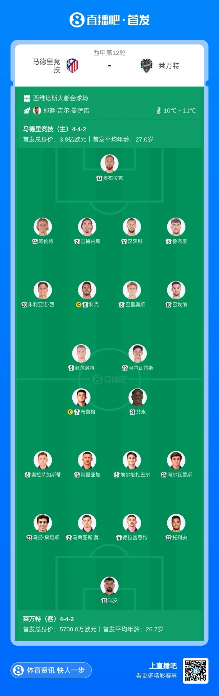 11月9日讯 西甲第12轮,马竞对阵莱万特,赛前首发公布。