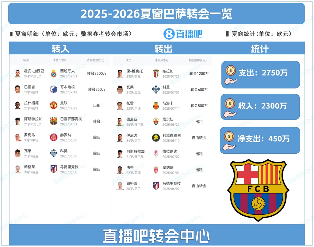 净支出450万!巴萨夏窗:引进加西亚&拉什福德 法蒂、伊尼戈离队