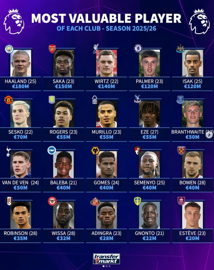 8月17日讯 新赛季英超已经开幕,德转也盘点了英超20支球队中身价最高的球员,其中哈兰德1.8亿欧领衔,具体如下:曼城:哈兰德 1.8亿欧阿...