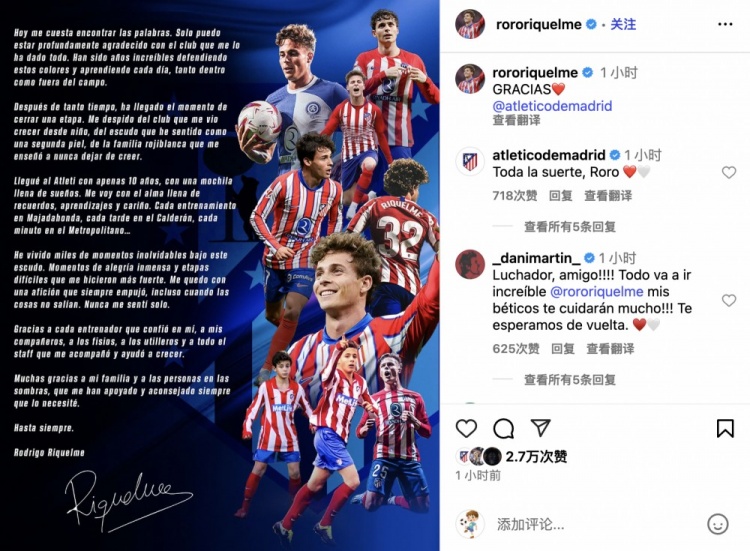 里克尔梅深情告别马竞:我10岁背着梦想来这里,如今带着灵魂离开