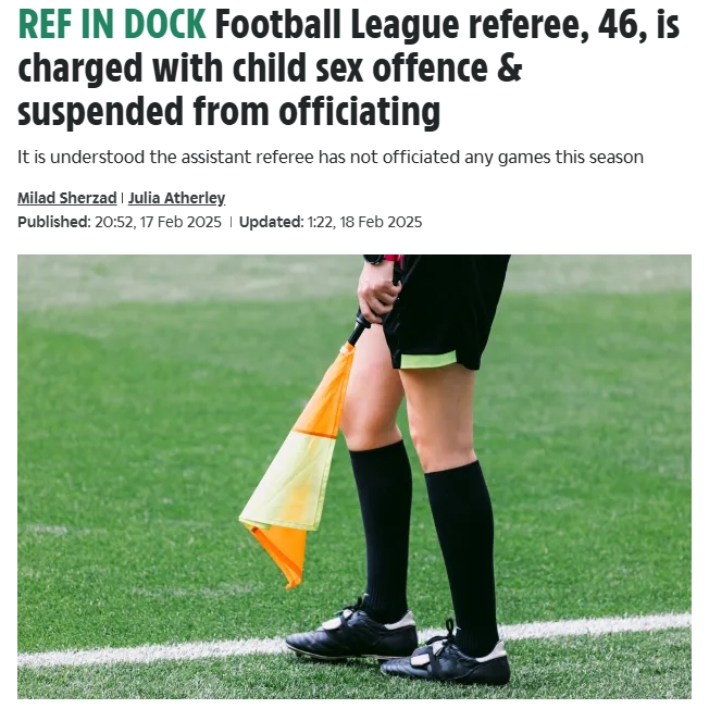 太阳报:46岁前英甲裁判被指控与15岁女孩发生性关系,将出庭受审