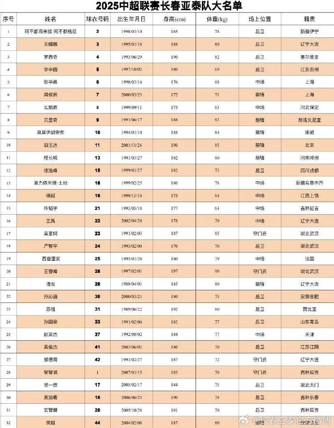 2025长春亚泰大名单 第12人继续专属12号 全队平均年龄为26.9岁