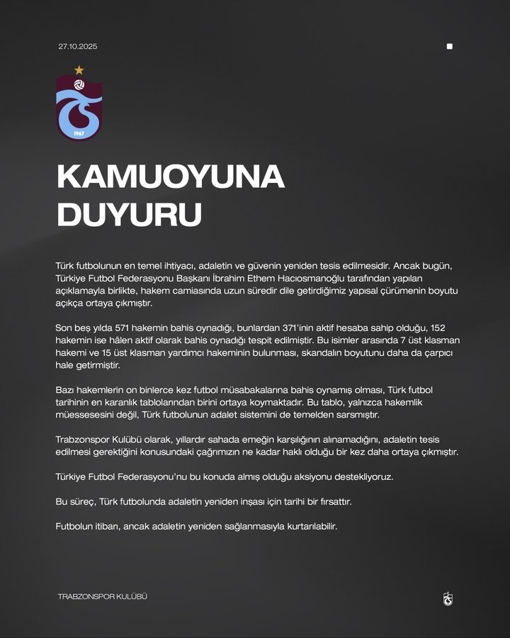 10月27日讯 土超特拉布宗俱乐部发表公开声明,回应土耳其足协主席哈奇奥斯马诺格鲁所揭露的裁判界“结构性腐败”问题。特拉布宗俱乐部发布...