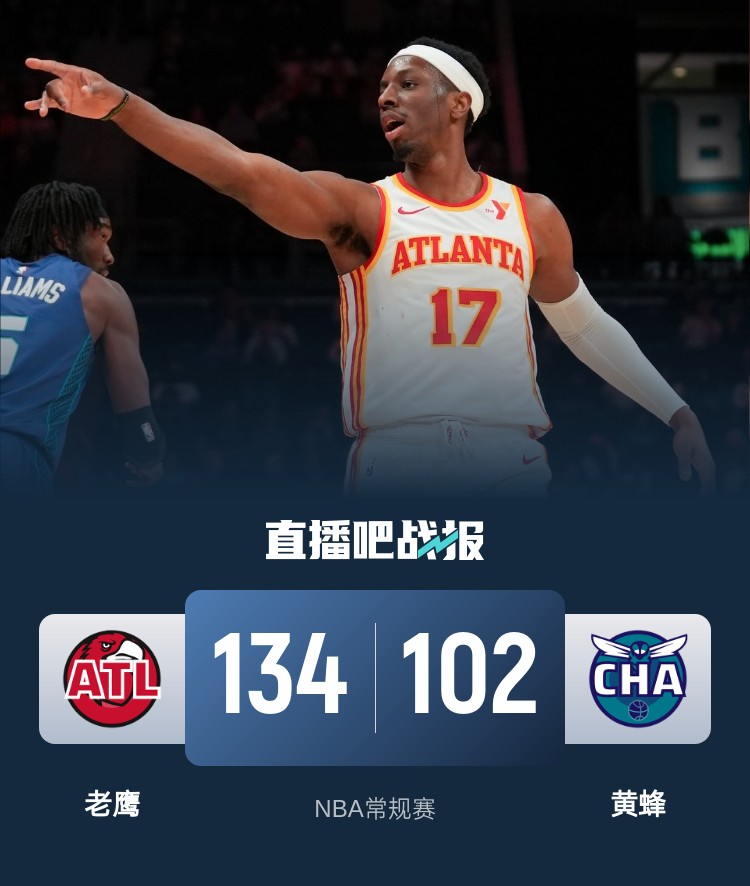 比赛开始后老鹰就在防守端展现出不错的强度,多次形成抢断和封盖,奥孔武连中三记三分帮助老鹰建立优势。杰弗里斯找到手感连续拿分回应,黄蜂一路追到只差1分。第二节老鹰率先发力又将分差拉大到两位数,黄蜂虽然期间多次掀起反扑,但老鹰外线手感不错多次回应三分,半场结束前老鹰又是连连打出反击巩固优势。易边再战,老鹰上来一阵三分雨直接将分差拉大到20分以上,其中里萨谢独中三元。此后黄蜂也无力再缩小分差,老鹰末节依旧轻松掌控场上局面,迪亚巴特受伤,最终老鹰134-102大胜黄蜂结束2连败,黄蜂连遭两场大败。