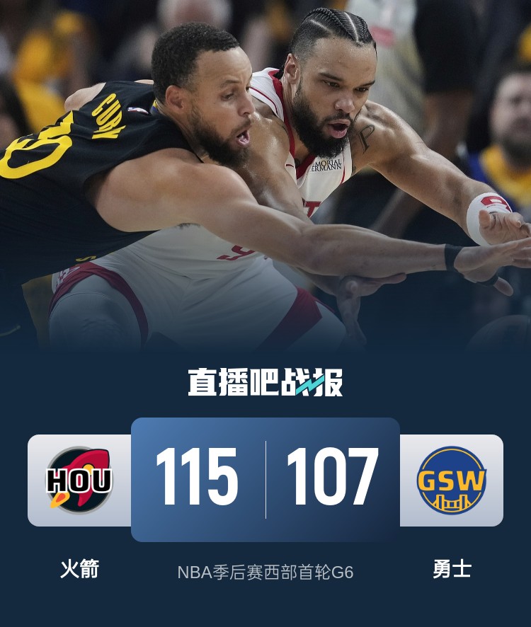 比赛开始,火箭率先发力打出11-5的开局,追梦击打杰伦-格林被吹恶意犯规,勇士内外开花迅速反超,火箭2记三分稳住局势,次节双方继续缠斗,火箭不断冲击内线连投带罚拿分,一度将分差拉开到两位数,库里和巴特勒联手拿到10分迅速咬住,半场战罢火箭53-48领先勇士。易边再战,巴特勒和范弗里特对飙三分,双方围绕5分左右分差展开激烈争夺,火箭继续冲击篮筐拿分,勇士外线开火顽强咬住,科尔“砍”亚当斯但效果不佳,库里连投带罚追到2分分差,末节范弗里特打成3+1,火箭攻防两端压制勇士,连投带罚一举将优势扩大到17分,勇士再度“砍”亚当斯,但后者稳定的罚球帮助球队保持优势,最终,火箭115-107力克勇士,将比赛拖入抢七。