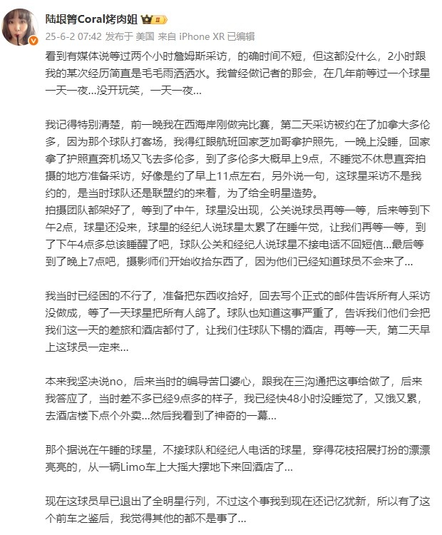 6月2日讯 前记者、莱昂纳德中方经纪人“烤肉姐”陆垠箐发文谈到了此前采访的NBA球星。