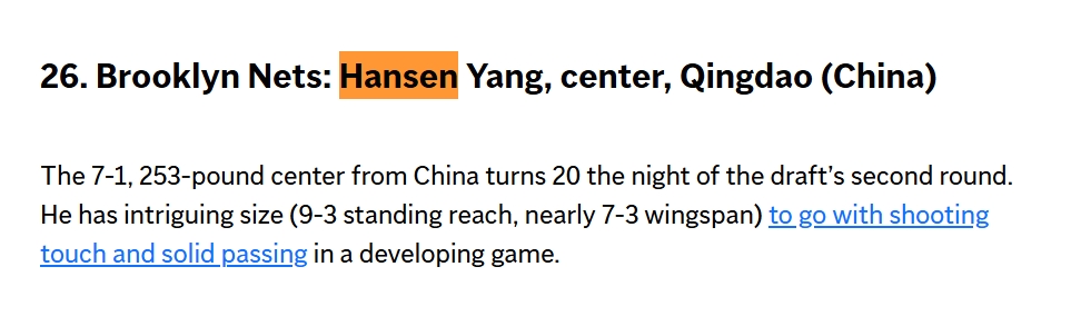 06月05日讯 世界四大通讯社之一的美联社今日更新模拟选秀,杨瀚森预计首轮26顺位被篮网选中。