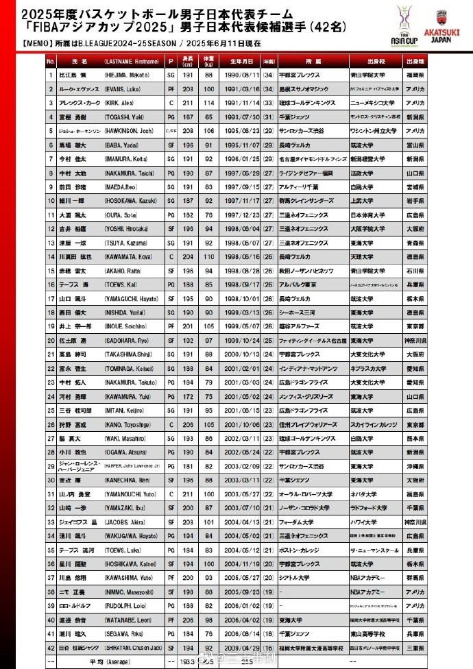 在晒出的日本男篮集训名单中,多达42人,其中:河村勇辉、马场雄大、比江岛慎、富永启生、富坚勇树等主力球员在列,归化球员霍金森、科克、埃文斯等也在。而渡边雄太和八村塁不在其中。