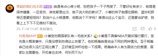 “就是有点心疼小杨,别把孩子一下子用废了,不管好处有多少,前提是保持健康,一旦受伤,其他都是扯淡。就不说大姚的教训了,小崔的例子就摆在眼前,篮协和郭导还是要短视吗?别说什么小杨愿意,他敢说个不字吗?难得出这么个宝贝,还是要当驴使,我看上上下下不见棺材不落泪。”网友写道。