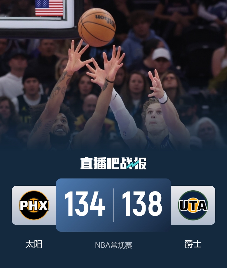 此役一上来爵士率先找到感觉,马尔卡宁予取予求单节狂揽14分,率队轰出19-2梦幻开局,首节结束时爵士已经领先12分,次节回来,场上形势风云突变,太阳回敬18-2小高潮,末段两队你来我往陷入僵持,半场战罢,爵士保有3分优势。短暂休整后爵士再度确立两位数优势,但布克率队一波13-2实现反超,爵士迅速回敬13-1攻击波,三节结束后爵士依然领先8分,末节决战,马尔卡宁联手乔治不断取分,太阳连中三分保留悬念,决胜时刻太阳挑战成功,马威补篮绝平,马尔卡宁绝杀未果进入加时,阿伦外线对飚马尔卡宁,决胜时刻额乔治联手马尔卡宁锁定胜局,最终爵士138-134力克对手。