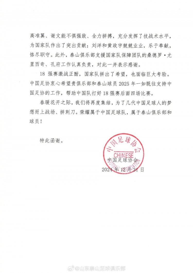 对此,泰山俱乐部也回复称:“山东泰山足球俱乐部收到中国足球协会感谢函,感谢俱乐部在2024年对国家队的大力支持与无私奉献。这份肯定是对俱乐部工作的激励,更是鞭策我们未来继续为中国足球事业贡献力量的动力,我们将始终与国家队并肩,为中国足球的美好明天共同努力!”