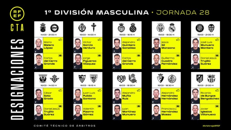 3月13日讯 西甲第28轮联赛各场执法裁判公布,曼萨诺执法比利亚雷亚尔vs皇马,本戈切亚执法马竞vs巴萨。
