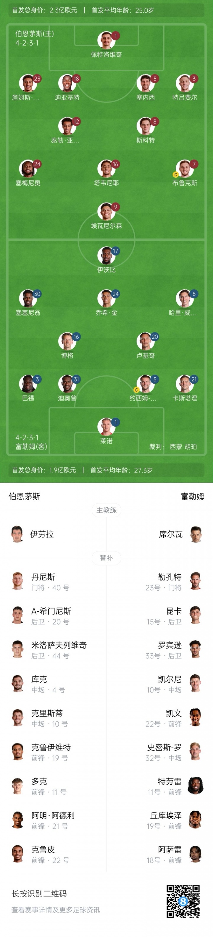 伯恩茅斯替补:40-丹尼斯、20-阿莱克斯·希门尼斯、44-米洛萨夫列维奇、4-库克、10-克里斯蒂、11-多克、19-克鲁伊维特、17-阿明·阿德利、22-克鲁皮